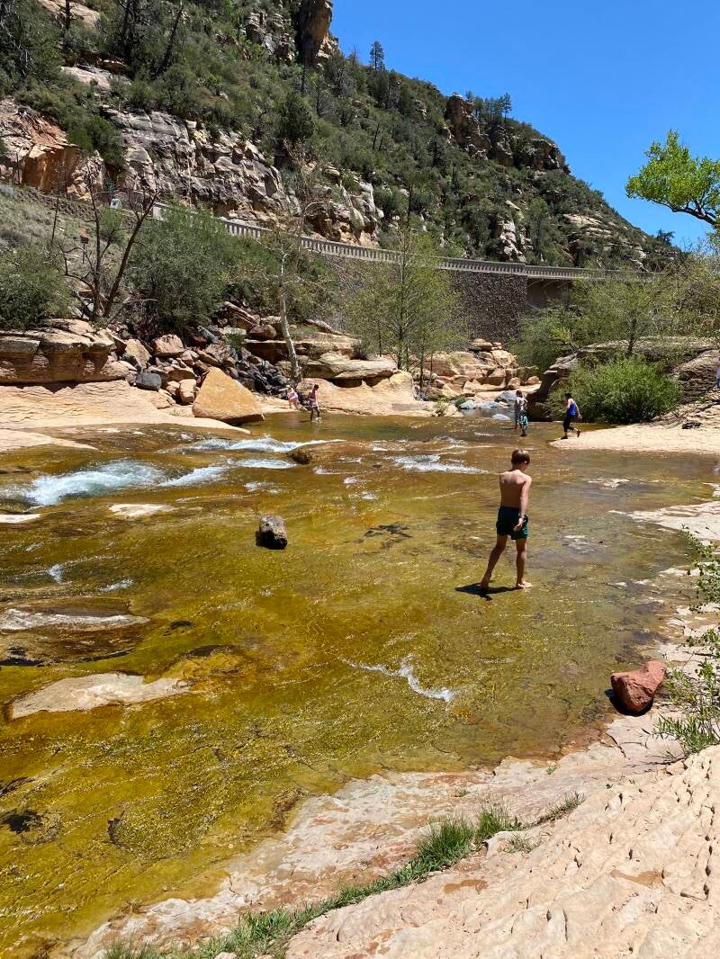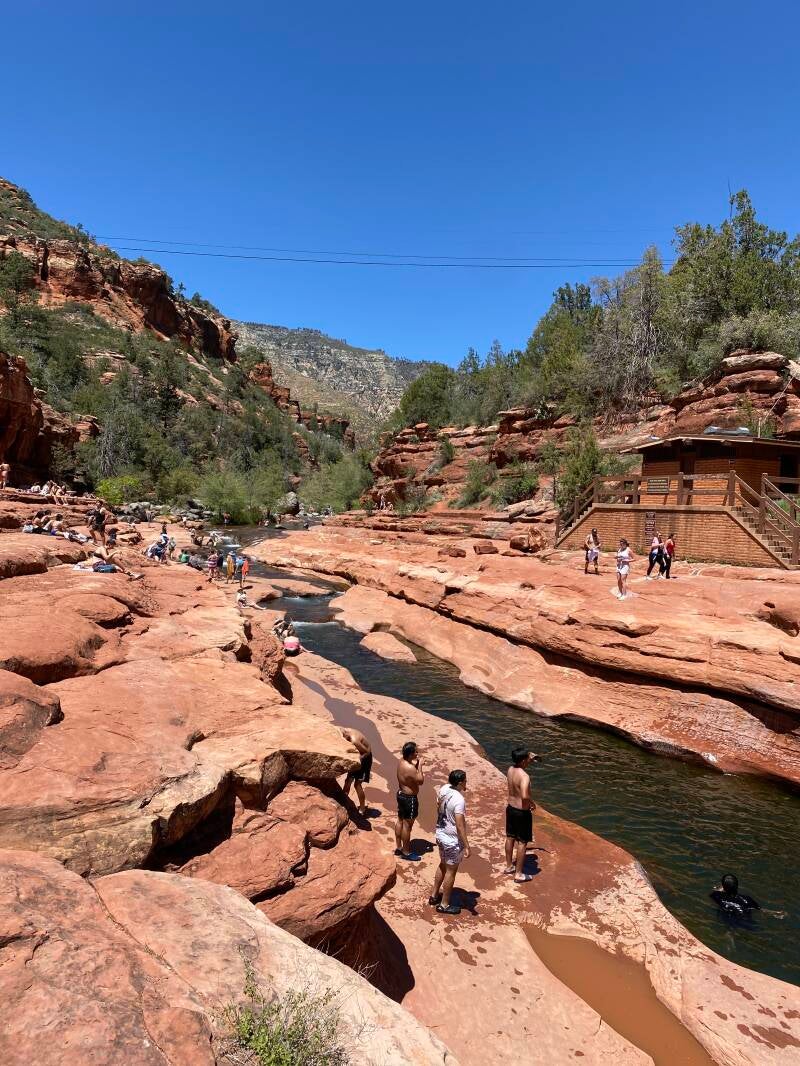 Sedona is van oudsher een hippie plaatsje dat behoorlijk “gehypet” wordt oa vanwege de energetische straling. Het is een plaatsje met veel terrasjes, gezellige winkelstraatjes en restaurants en wordt omringd door bergen waar je natuurlijk weer prachtige hikes kan maken. Na een korte stop gaan wij door naar het Sliding Rock State park, waar de rivier van de vele glibberige rotsen in de kloof diverse natuurglijbanen heeft gemaakt. Leuk om te bezoeken en te proberen, zeker in de warme zomers!